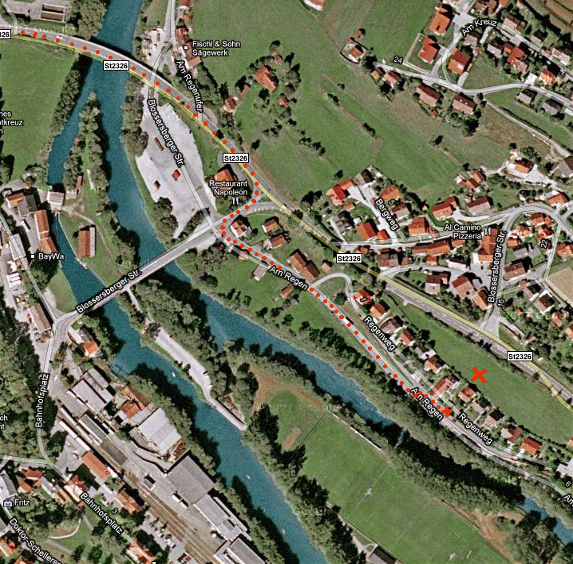 Nach dem überfahren der Regen Brücke biegen Sie rechts in die Blossersberger Straße ein und nehmen die nächste gleich links Am Regen.